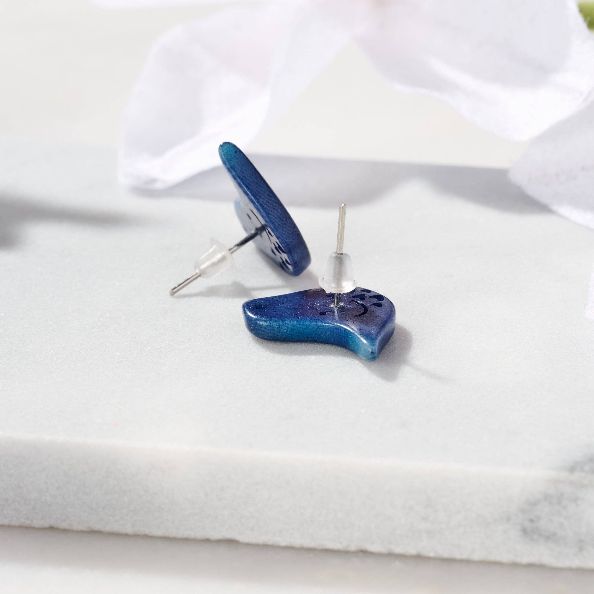 Let your style soar to new heights with these playful bird earrings! Made of tagua in a gorgeous regal blue, stainless steel posts make this petite pair an easy, comfortable wear. A lovely way to a delightful touch of whimsy to any outfit! Handcrafted in Colombia.  Materials: Tagua, Stainless Steel - Measures: .75"W x .5"H x .08"D - Colors: Blue, Silver - Care: Use a soft damp cloth to remove dust and dirt. Avoid humidity. - Handcrafted in Colombia
