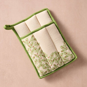 Bring festive charm and artisan craftsmanship to your holiday kitchen with this 100% cotton potholder. Made from cream-colored cotton and accented with a cheerful block-printed holly design in green and red, holder doubles as an oven mitt making it as functional as it is beautiful. A matching green border and hanging loop add a thoughtful touch, while a front pocket makes it easy to slip your hand inside for a secure grip. Heat-resistant batting between the layers offers extra protection when handling hot dishes. A festive essential for joyful cooking and baking all season long. Complete your holiday kitchen style by pairing it with the coordinating table runner and tea towel.