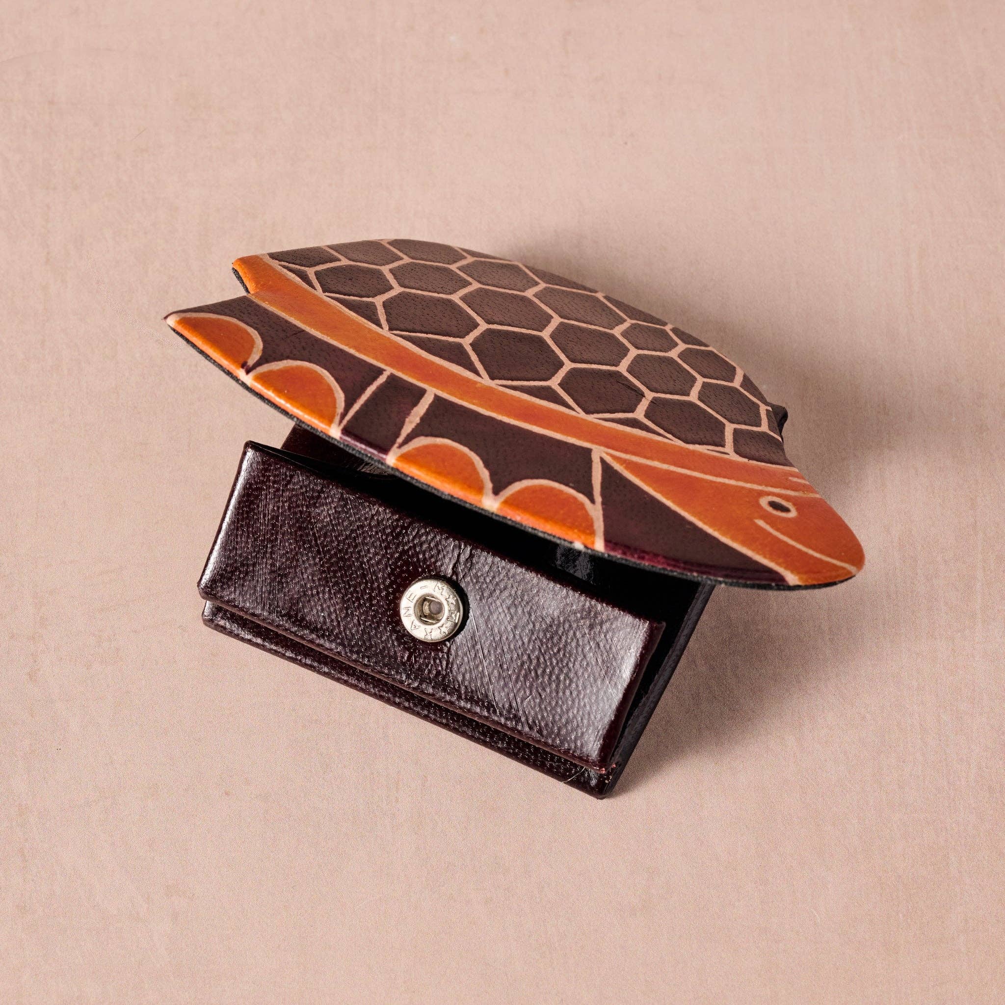 Keep all of your change handy while adding a touch of whimsy to your bag or pocket with this sweet coin purse. Made from supple goat leather - a biproduct of the meat industry that might otherwise go to waste - in rich dark brown and orange tones. The charming design features a smiling, two-dimensional turtle with a hexagonal shell and playful eyes. The cleverly concealed square compartment opens from the back with a secure silver snap, offering a fun and functional way to carry coins and small essentials. Handcrafted in India by the artisans of Craft Resource Center Pvt. Ltd. (CRC), a guaranteed Fair Trade Organization creating sustainable income opportunities for marginalized communities by blending traditional skills and ethical practices with globally competitive design, quality and innovation while preserving the dignity of labor and empowering artisans through fair trade, technology and skill development.