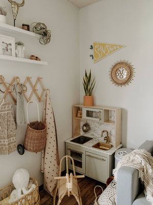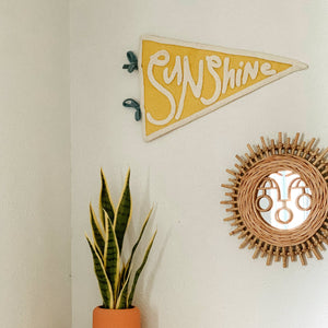 Add a joyful statement to your kid's room with the cute and vibrant Felt Sunshine Pennant. The pennant-style flag is made of felted bright yellow wool and finished with baby blue tassels and white cursive writing. Each letter is cut by hand and stitched on the vibrant background, taking hours to make each unique pennant. Hang this adorable piece of decor on a feature wall, above a crib, or hanging on curtain rods for a timeless decoration. Felted wool, Azo-free dyes, eco-friendly and non-toxic. 12" tall x 19" wide.