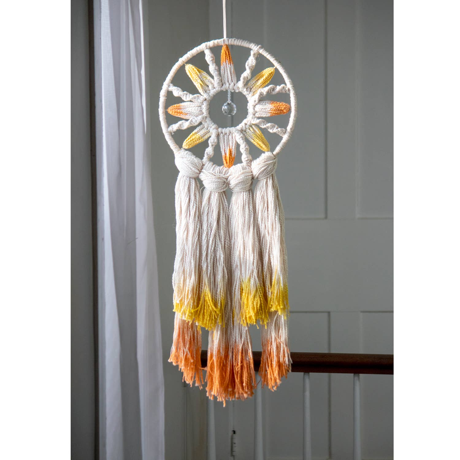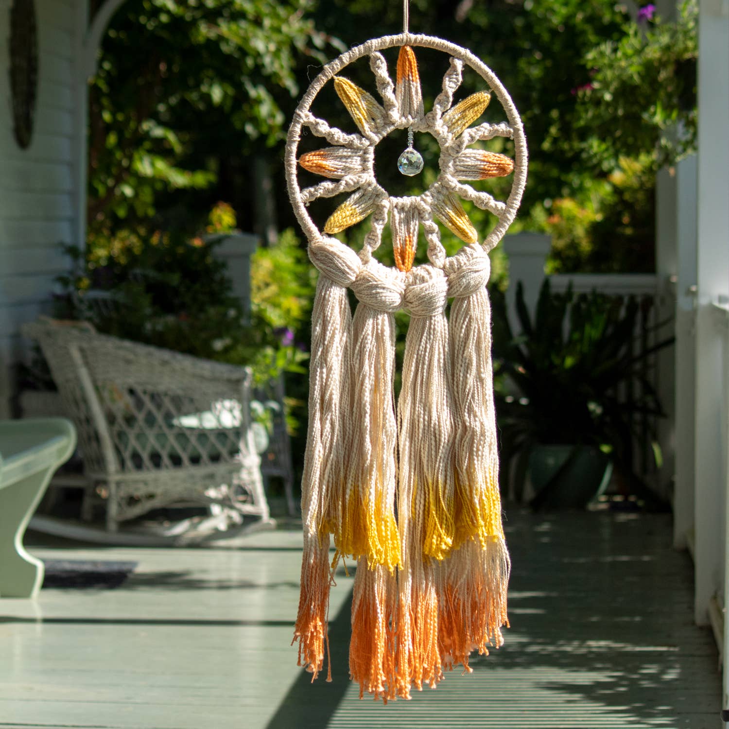 Our beautiful handwoven wall hangings are constructed with locally sourced cane, sustainably harvested woolen yarns, natural cotton and webbed with a long-lasting wax covered thread. Some styles are further decorated with beautiful stones, beads, seeds and a genuine lead crystal prism. Handmade in Nepal at a woman-owned production center. Includes a Fair Trade Home & Garden tag. 31.5"h x 12"w